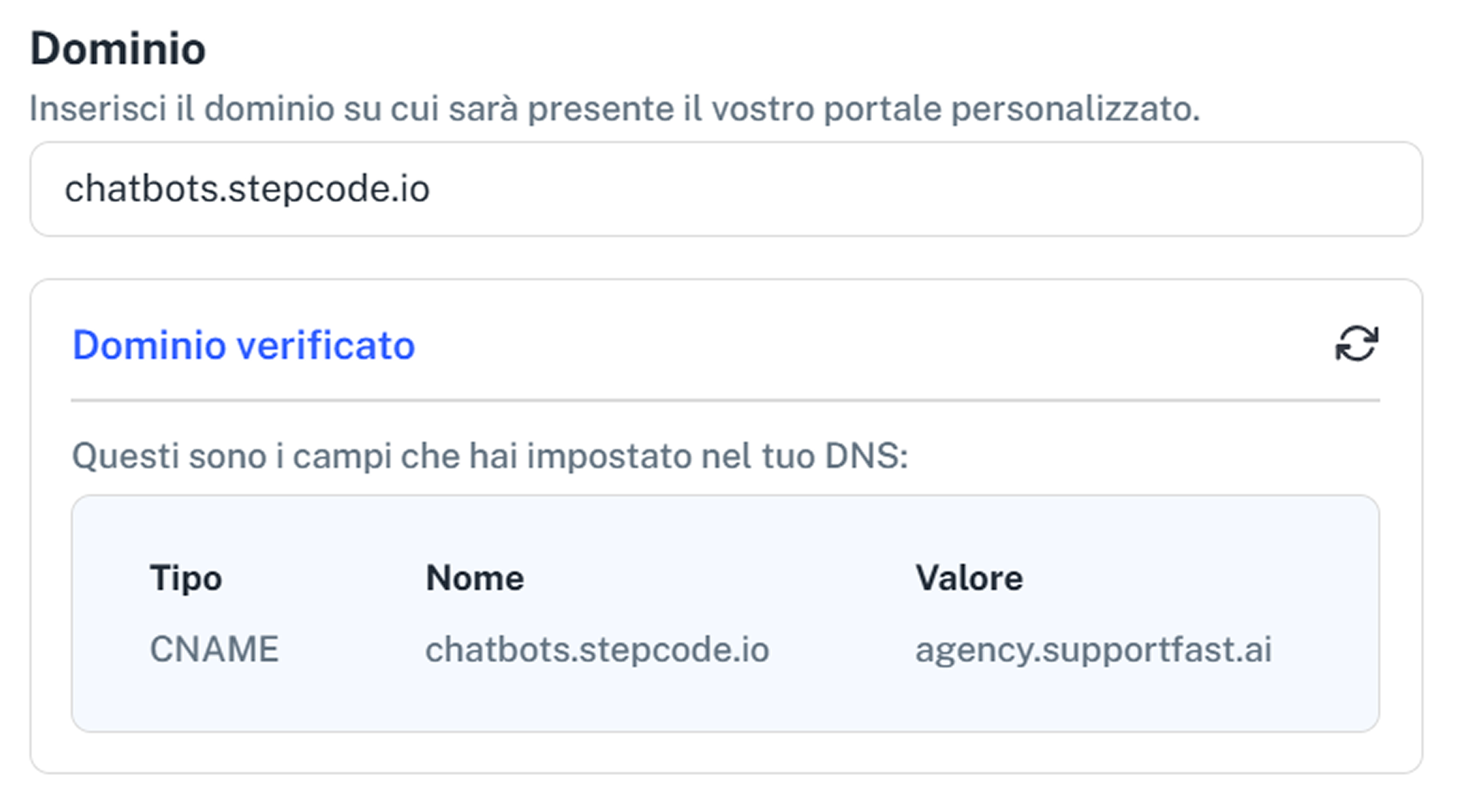 Una volta completata la configurazione, il sistema verificherà automaticamente lo stato del dominio e mostrerà se risulta correttamente verificato.