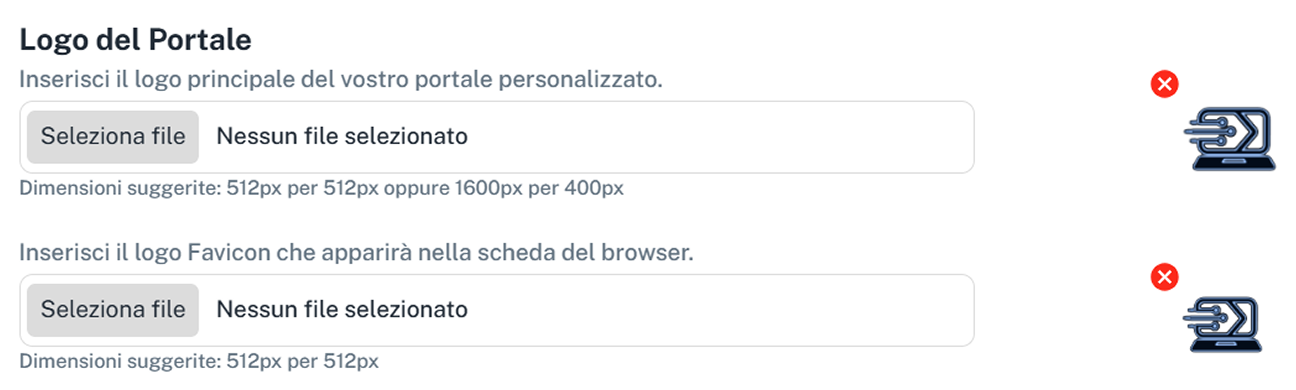 È inoltre possibile caricare un logo separato per la favicon del browser. Anche in questo caso, è consigliato un formato quadrato (512 × 512 px) per garantire una resa nitida. Favicon non quadrate potrebbero apparire sgranate.